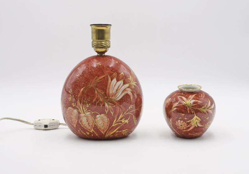 Kulista lekko spłaszczona podstawa lampy i kulisty, owoidalny wazonik z obręczową szyjką; dekorowane złoconymi gałązkami i fantazyjnymi kwiatami na rdzawym „marmoryzowanym” tle.