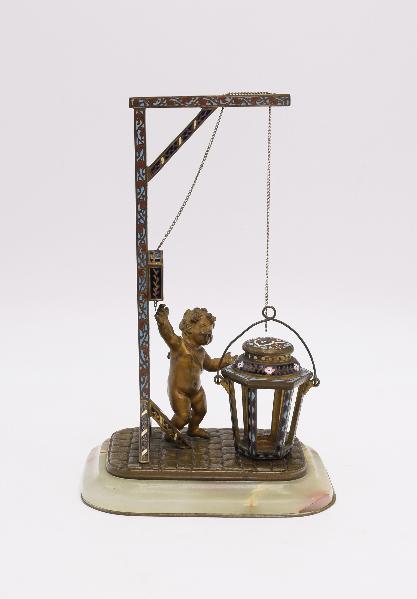 Na prostokątnej plincie z onyksu podstawa imitująca bruk z konstrukcją latarni, do której sięga amorek, by ją opuścić i zapalić.