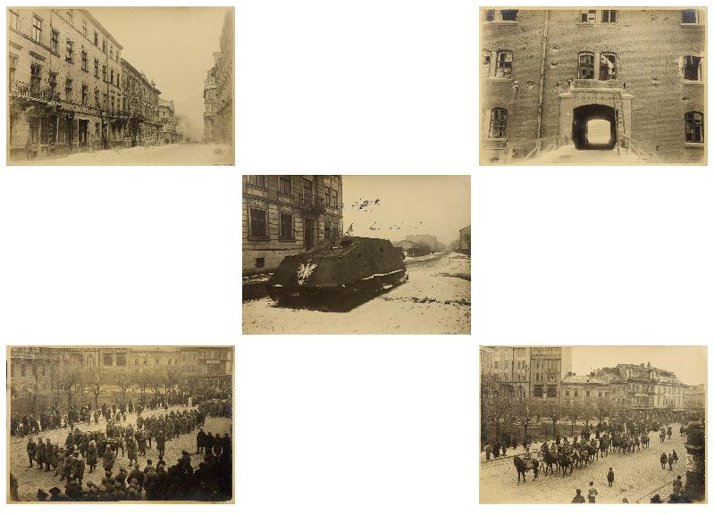 Zestaw 5 fotografii z motywami wojskowymi i lwowskimi