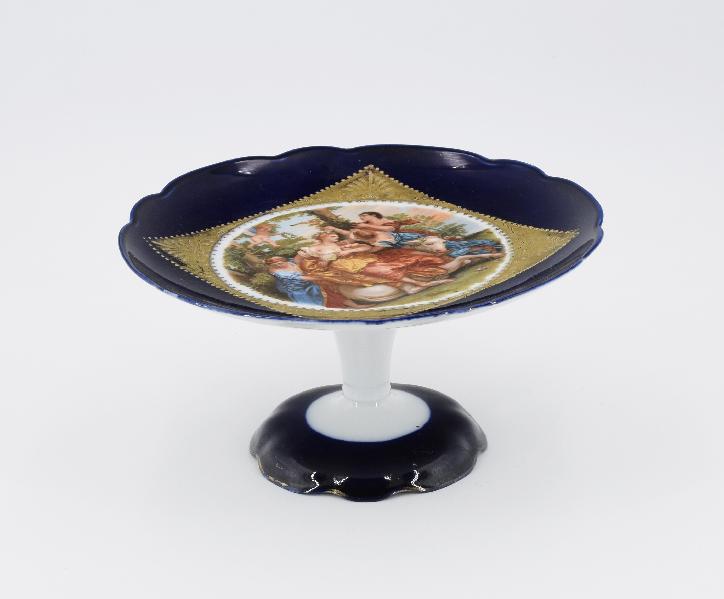 porcelana, kobalt podszkl. - bleu roi, złocenia błyszczące i matowe, kalka barwna, drobne przetarcia złoceń; wys. 12,5 cm, średn. patery 24 cm, średn. stopy 12,3 cm; sygn. kobaltem podszkl. tarcza opaskowa, w szkliwie druk zielony: austriacki orzeł 2-głowy pod koroną zamkniętą z krzyżem, poniżej półkoliście: AUSTRIA, z boków nad koroną: M Z.