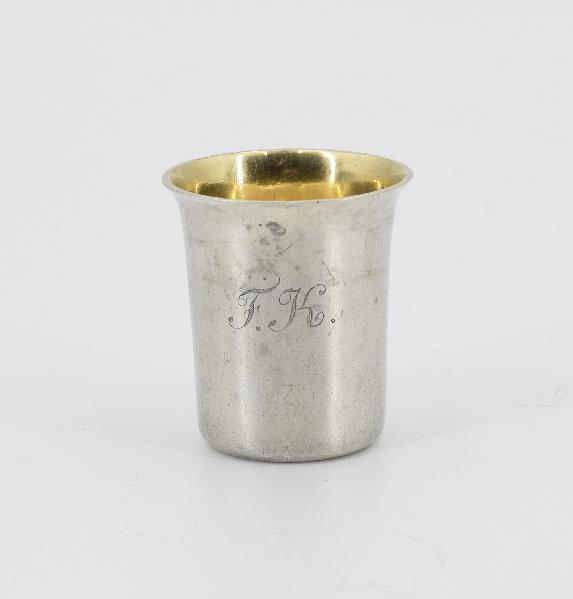 Kubeczek gładki, koniczny, o rozchylonej krawędzi i złoconym wnętrzu; na płaszczu grawerowane inicjały F.K.